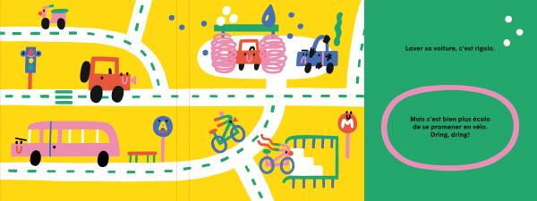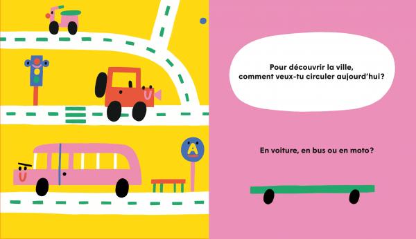Ce livre aux couleurs vives se déplie créant ainsi un tapis de jeu pour permettre aux enfants, après la lecture, de continuer à faire rouler leur imagination. Une fois complètement déployé, ils pourront faire circuler leurs petites voitures et continuer de les faire voyager.