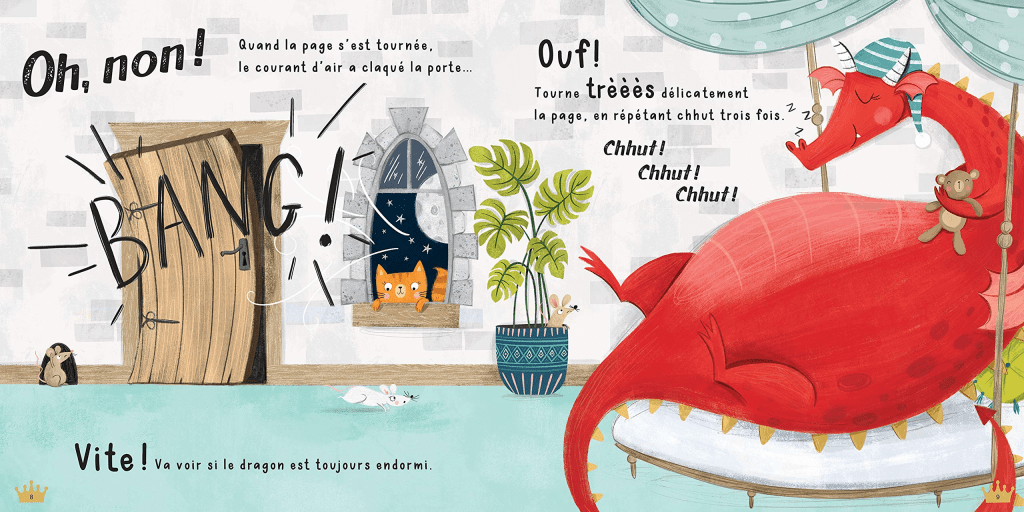 Chut, il ne faut pas faire de bruit! Le dragon du livre s’est endormi. Une mission qui ne sera pas de tout repos étant donné que le reste de royaume est bruyant…