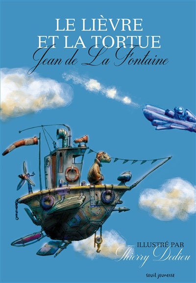 Dans cet album, la célèbre fable est revisitée dans l’espace. Le lièvre conduit une fusée tandis que la tortue est à bord d’un bateau volant construit dans sa carapace.