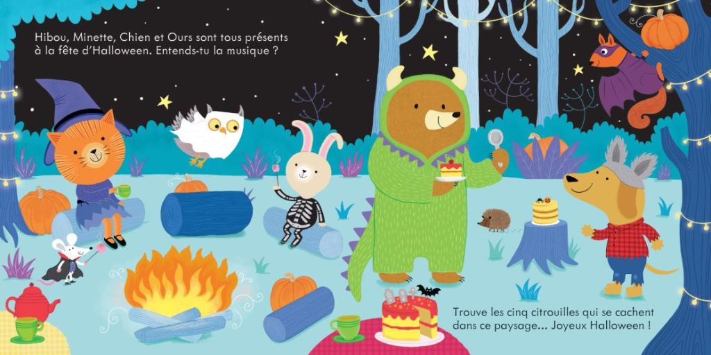 La collection J’écoute, je trouve porte bien son nom. Les tout-petits sont invités à appuyer sur les puces sonores (5 au total) et à chercher quelques citrouilles dans les illustrations.