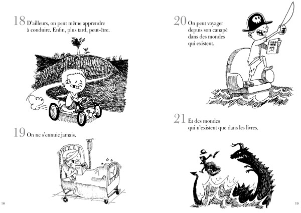 Le titre résume à merveille son contenu. Le créateur du livre énumère et illustre (en noir et blanc) une longue liste des bienfaits de la lecture.